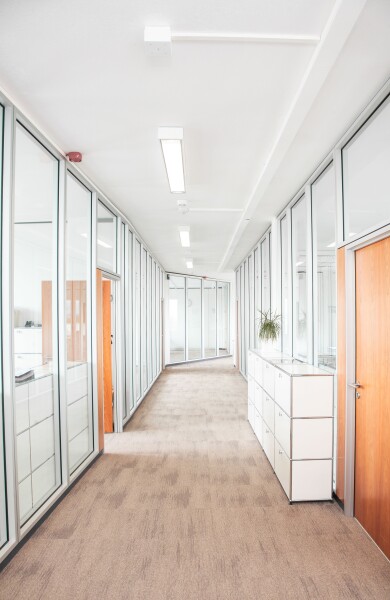 Glastrennwände mit Aluminiumrahmen & Türen aus Amerik. Kirschbaum
