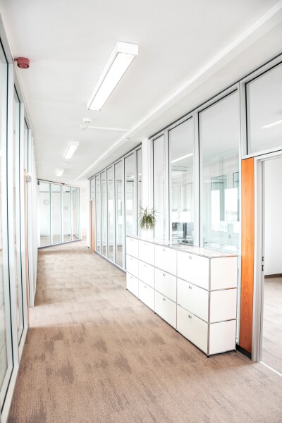 Hochwertige Glastrennwände mit Aluminiumrahmen & Türen aus Amerik. Kirschbaum